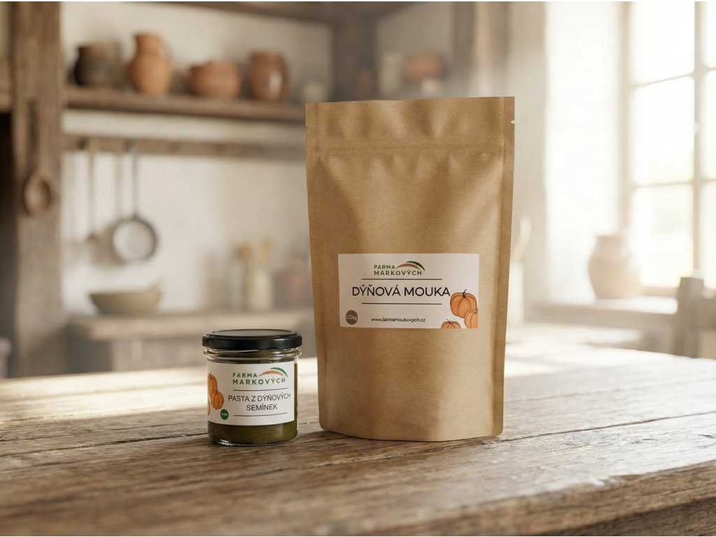 Dýňová mouka je koncentrovaný zdroj rostlinných bílkovin a minerálů. Surovina pochází ze Znojemska a zpracováváme ji mechanicky za studena přímo u nás na farmě v Únanově. Mouka vzniká po vylisování oleje, čímž v ní zůstává stabilní podíl bílkovin, vlákniny a klíčových minerálů v RAW kvalitě. Je přirozeně bezlepková a vhodná pro celiaky, sportovce i jako podpora mužského zdraví.